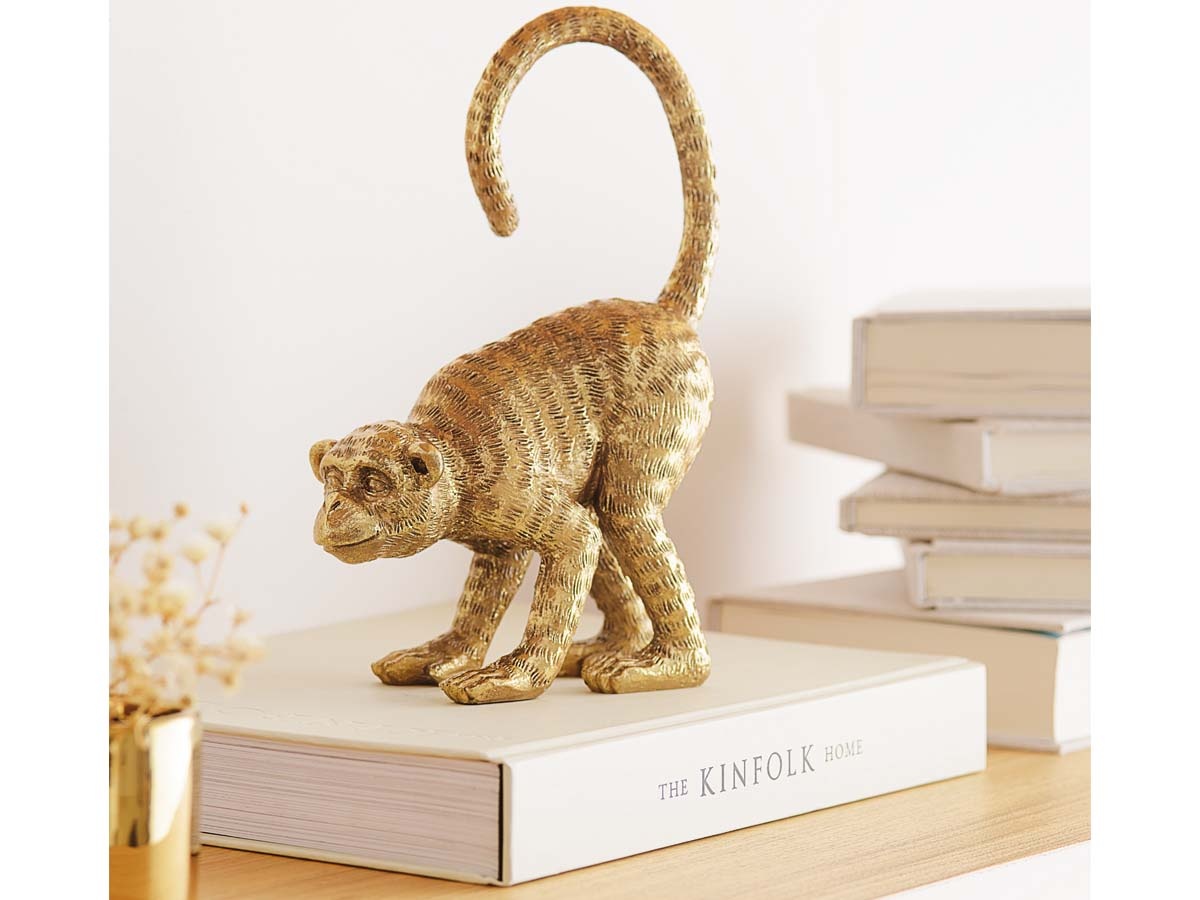 Escultura decorativa de macaco dourado em poliresina, material muito utilizado na decoração pois possui ótima resistência e durabilidade. Peça ideal para compor ambientes internos, agregando a sua composição charme e simplicidade. Considerada a terceira das artes clássicas, a escultura é a técnica de representar objetos e seres através da reprodução de formas.