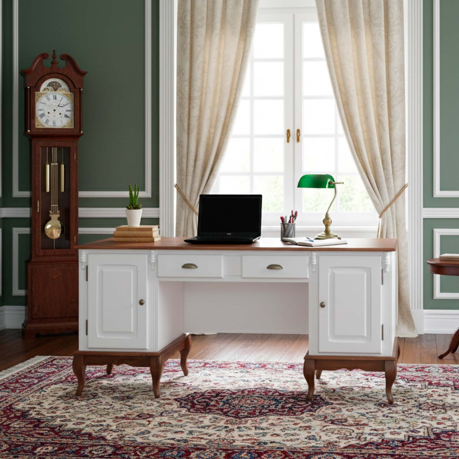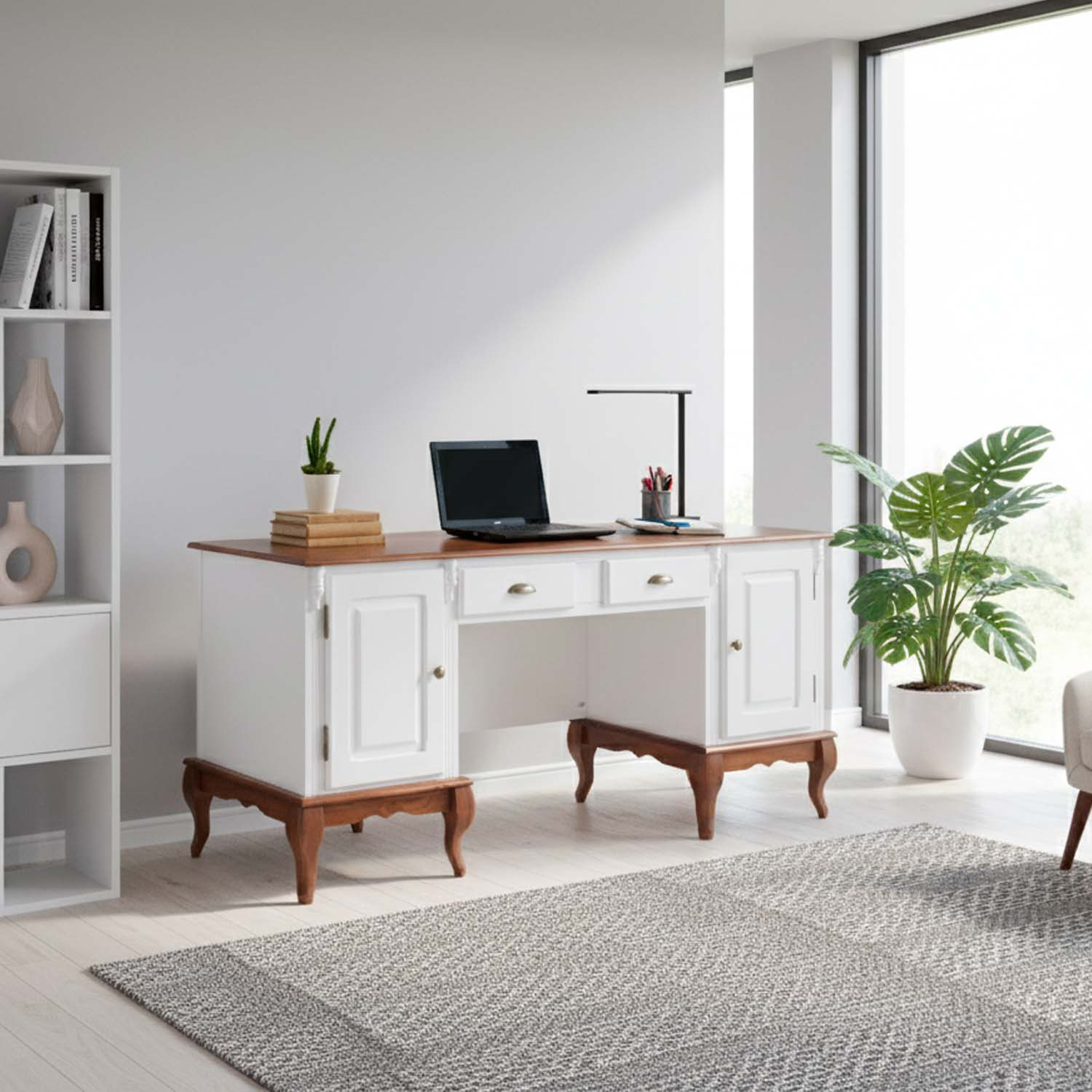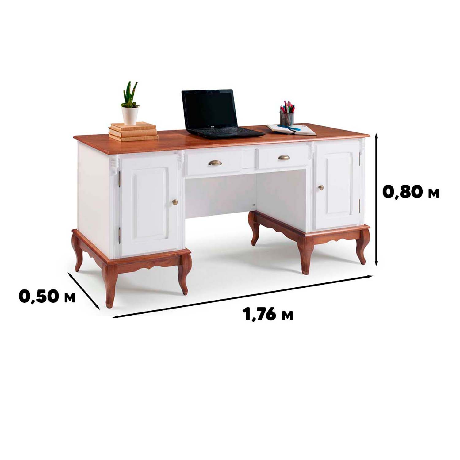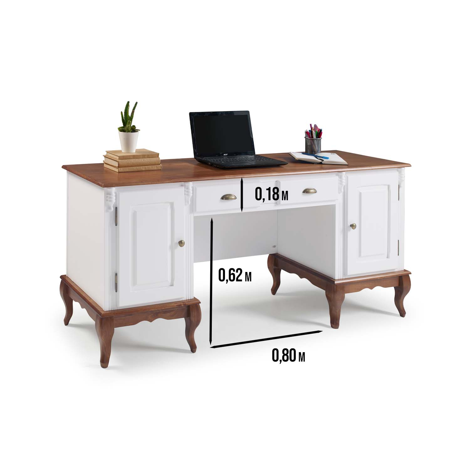 Escrivaninha 2 Portas 2 Gavetas Pés Luis XV Linz Móveis 80 x 176 x 50 cm (A x L x P). As escrivaninhas Linz são peças super resistentes, versáteis e funcionais, possuem 2 gavetas e 2 portas para facilitar a organização de itens. Com design retrô e pés Luis XV são ideias para criar uma decoração diferenciada em escritórios, home offices, salas de atendimento, quartos e outros. Móvel com ótimo acabamento e detalhes divisores de ambiente. Estrutura com pintura laqueada e tampo e base na cor Imbuia Glazer. Possui 0,80 m de altura por 1,76 m de largura e 0,50 m de profundidade. A escrivaninha de madeira é enviada montada.