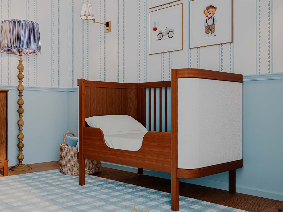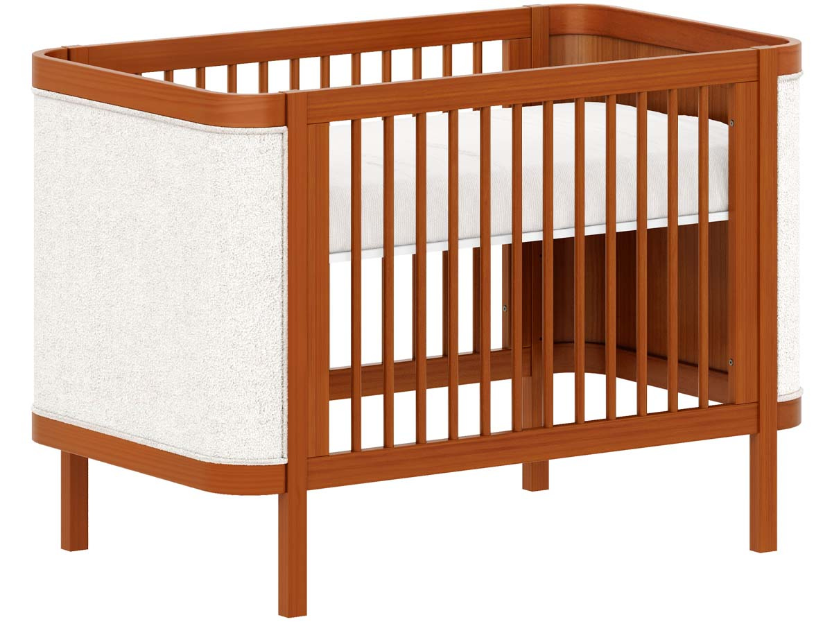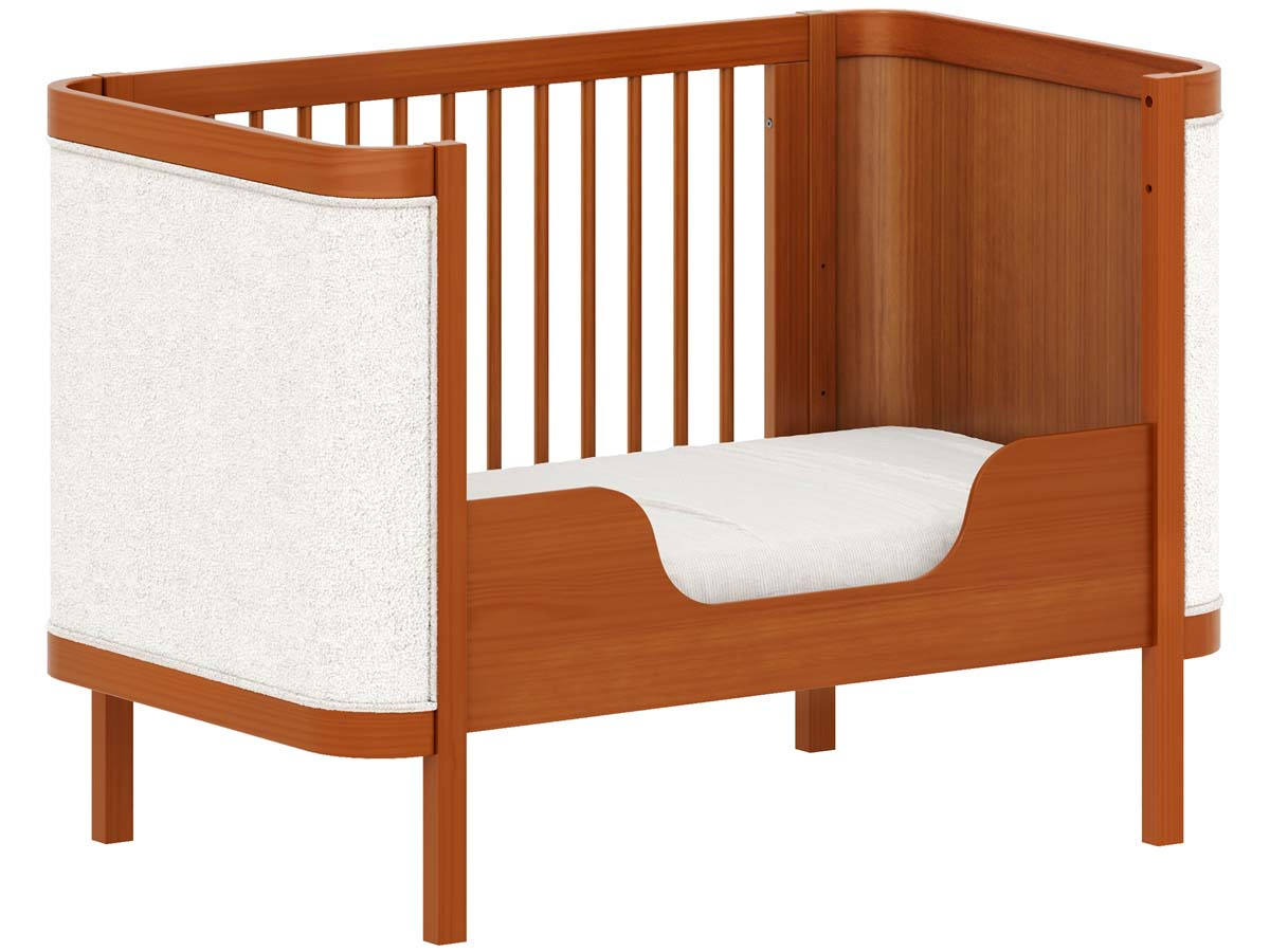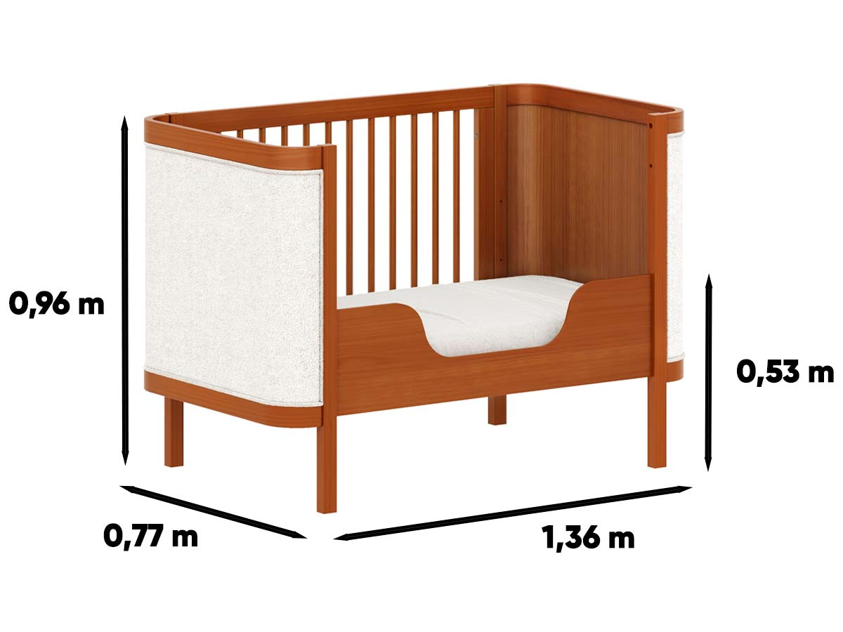 Berço de madeira 2 em 1 tecido Boucle 96 x 136 x 77 cm (A x L x P). Berço seguro e certificado pelo INMETRO 018923/2024. Uma linha para o quarto do bebê, diferente de tudo o que você já viu. Combinando elegância, funcionalidade e exclusividade, criada para transformar o ambiente do bebê sofisticado e acolhedor. Com a funcionalidade 2 em 1, ele se transforma em uma mini cama que conta com grade de proteção e cantos arredondados que garante a segurança que seu filho merece. Estrado com 3 regulagens de altura. O berço Soley é enviado desmontado.