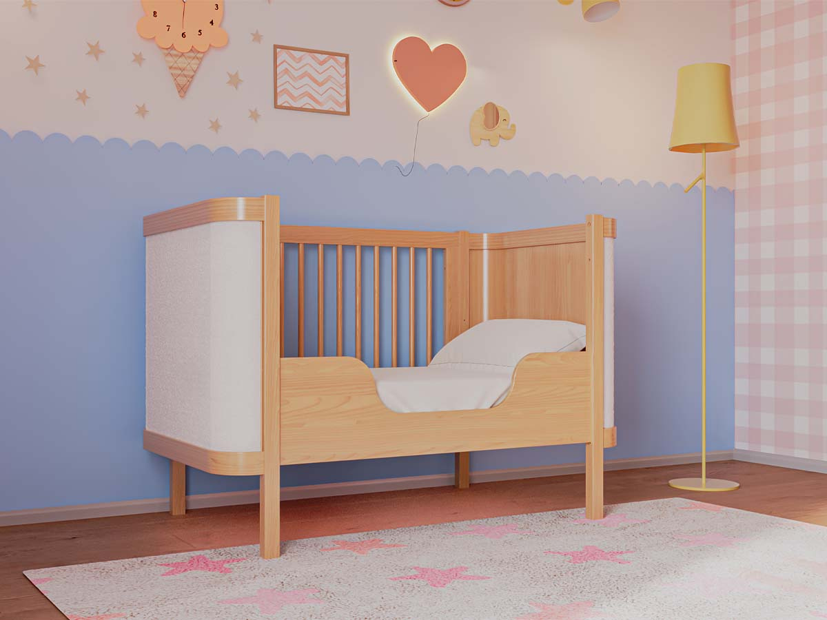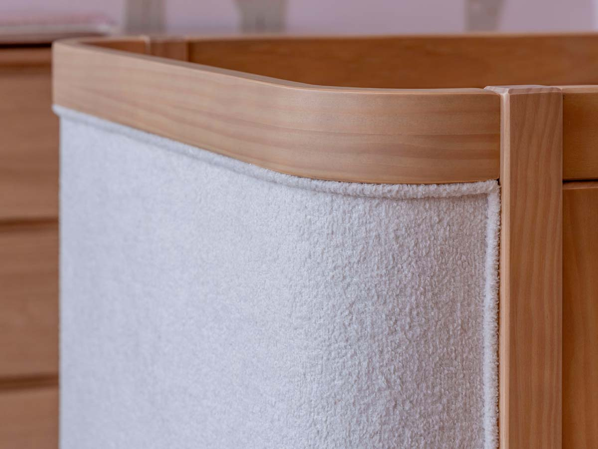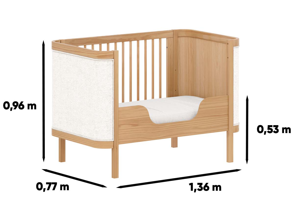 Berço de madeira 2 em 1 tecido Boucle 96 x 136 x 77 cm (A x L x P). Berço seguro e certificado pelo INMETRO 018923/2024. Uma linha para o quarto do bebê, diferente de tudo o que você já viu. Combinando elegância, funcionalidade e exclusividade, criada para transformar o ambiente do bebê sofisticado e acolhedor. Com a funcionalidade 2 em 1, ele se transforma em uma mini cama que conta com grade de proteção e cantos arredondados que garante a segurança que seu filho merece. Estrado com 3 regulagens de altura. O berço Soley é enviado desmontado.