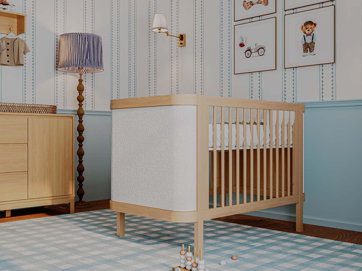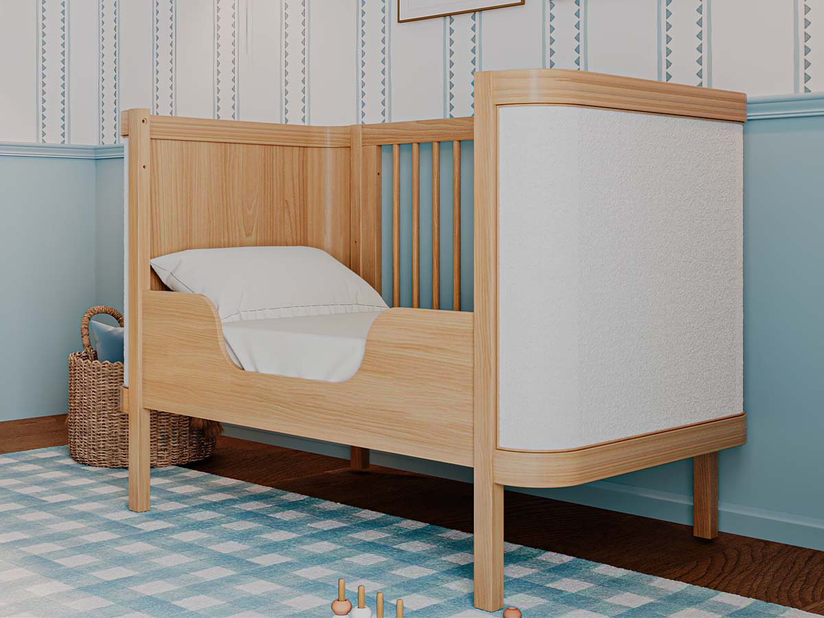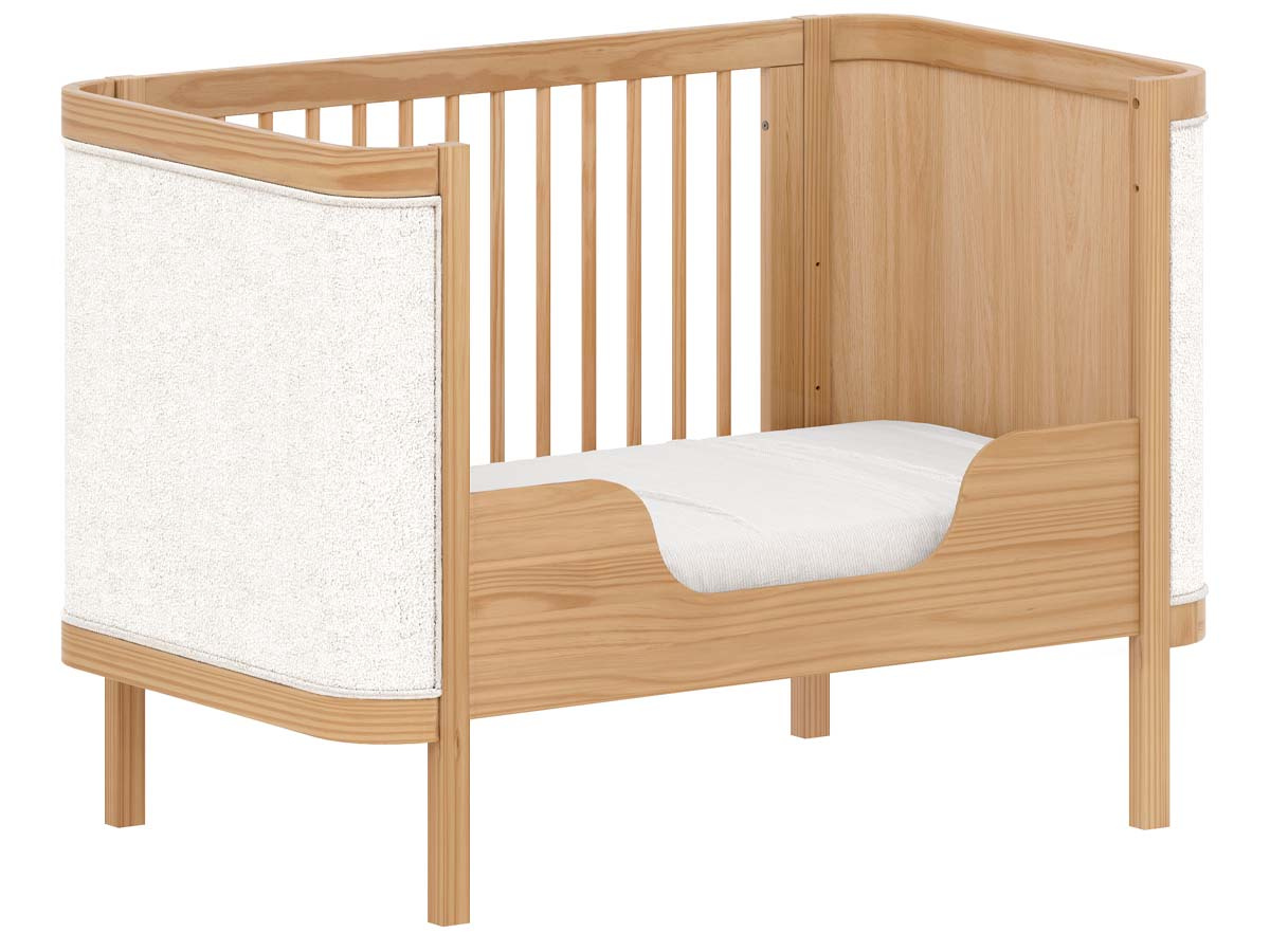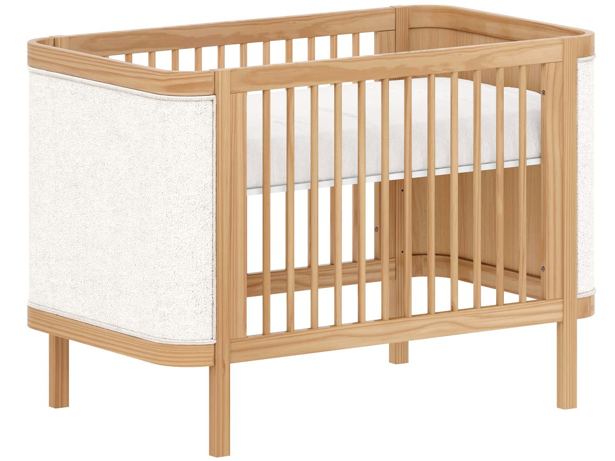 Berço de madeira 2 em 1 tecido Boucle 96 x 136 x 77 cm (A x L x P). Berço seguro e certificado pelo INMETRO 018923/2024. Uma linha para o quarto do bebê, diferente de tudo o que você já viu. Combinando elegância, funcionalidade e exclusividade, criada para transformar o ambiente do bebê sofisticado e acolhedor. Com a funcionalidade 2 em 1, ele se transforma em uma mini cama que conta com grade de proteção e cantos arredondados que garante a segurança que seu filho merece. Estrado com 3 regulagens de altura. O berço Soley é enviado desmontado.