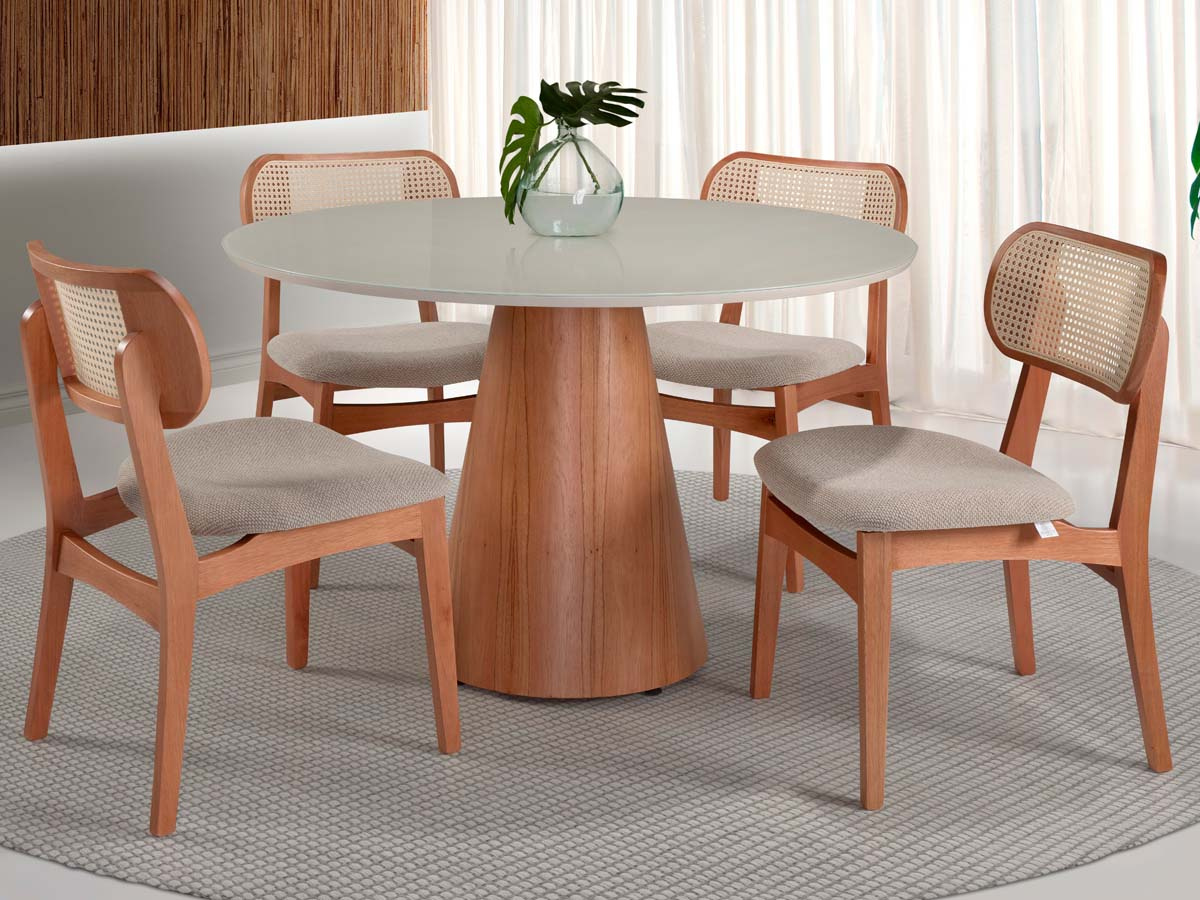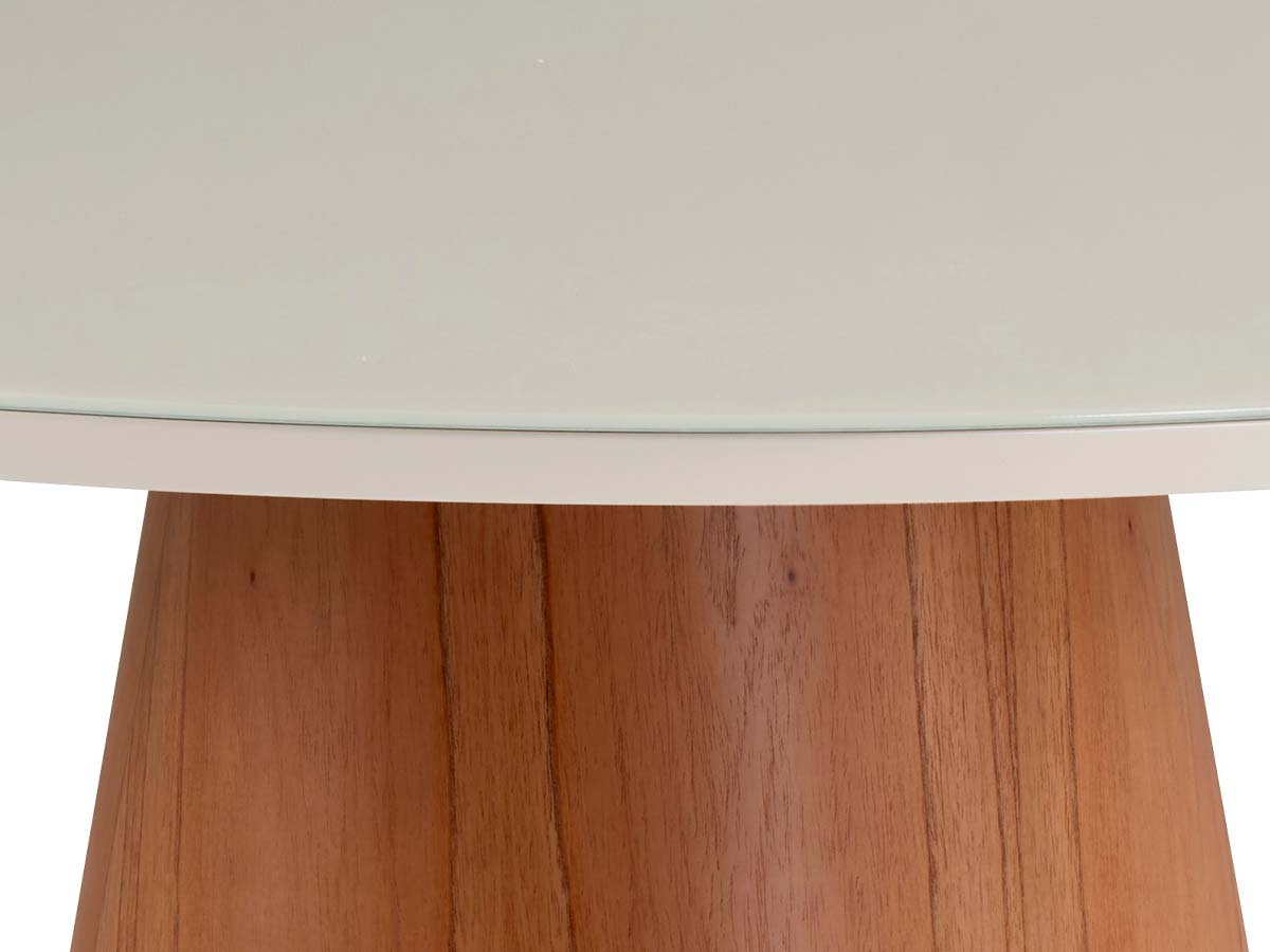 Mesa redonda Ambar tampo com vidro 100 x 100 x 78 cm (C x L x A). Mesa de jantar Ambar possui a base com um design moderno e elegante e tampo redondo que contrasta harmoniosamente com a base. A característica mais marcante é o seu pedestal central, que tem um formato cônico ou tronco-cônico e é feito de madeira laminada com um belo acabamento em tom natural, exibindo a textura e os veios da madeira. Esta base robusta confere estabilidade e um toque de calor e sofisticação ao móvel. Com estilo contemporâneo, minimalista e funcional, ideal para ambientes que buscam um visual limpo, mas com personalidade e materiais de qualidade. Produto enviado semi montado, tampo e base separados.