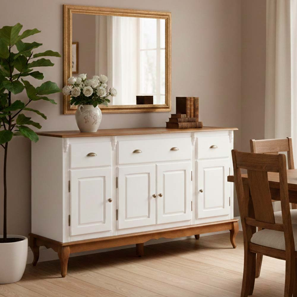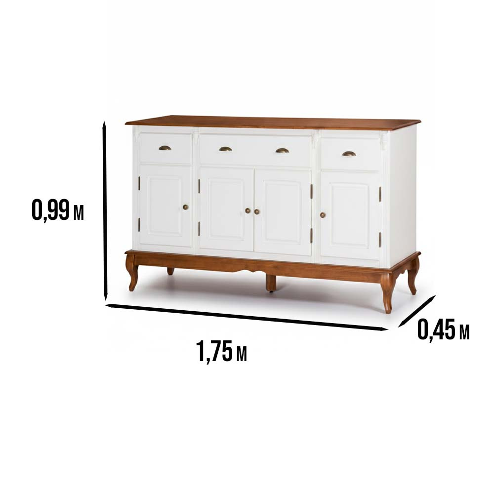 Balcão Hanover 4 portas 3 gavetas pés Luis XV 99 x 175 x 45 cm (A x L x P). O balcão Hanover é a peça central perfeita para quem busca combinar a elegância clássica com a durabilidade da madeira maciça. Com um design atemporal, ele transforma qualquer sala de jantar, sala de estar ou hall de entrada em um ambiente sofisticado.Equipado com três gavetas e quatro portas inferiores, oferece espaço generoso para organizar louças, talheres, toalhas de mesa e outros itens essenciais. Puxadores em metal bronzeado e pés em estilo Luiz XV adicionam um charme antigo e refinado à peça. Possui 0,99 m de altura por 1,75 m de largura e 0,45 m de profundidade. O balcão de madeira é enviado montado.