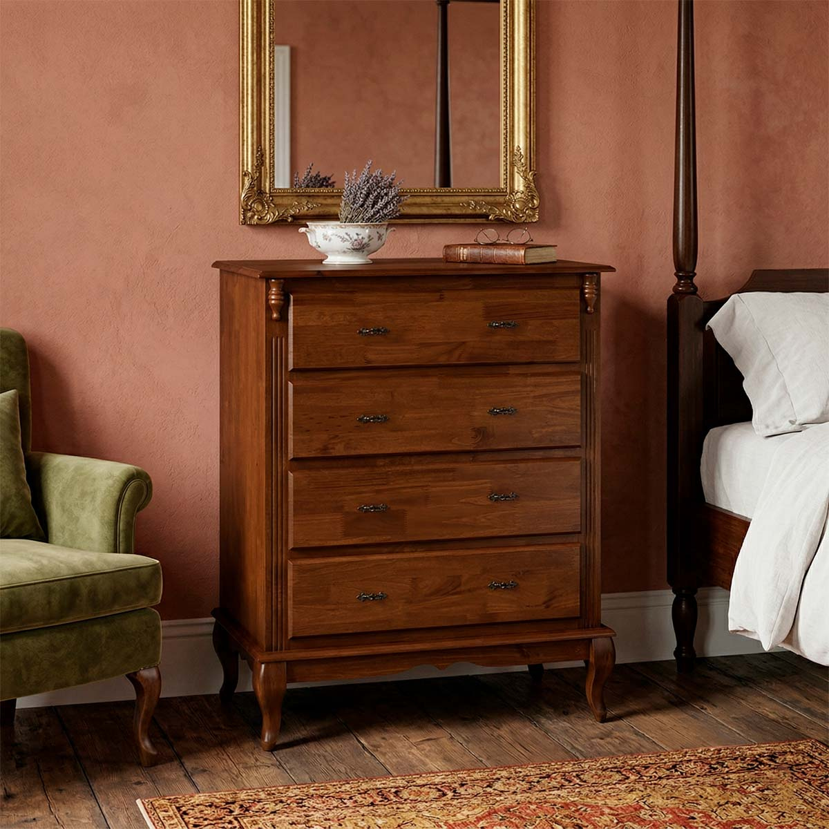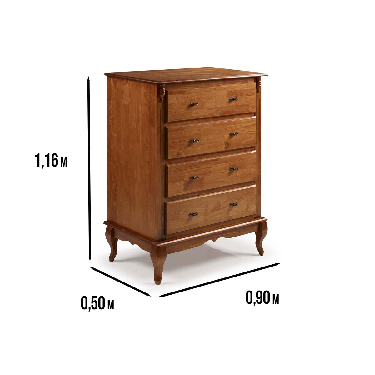 Cômoda de madeira Linz 4 gavetas 116 x 90 x 50 cm (A x L x P). Cômoda Linz com pés Luis XV, esta linha é perfeita para dar um upgrade na decoração de seu quarto, suas peças além de serem super versáteis e funcionais, contam com gavetas que facilitam muito o dia a dia e a organização de itens como roupas, livros, roupas de cama e outros, possuem também um design elegante agregando mais sofisticação ao ambiente. São móveis de extrema resistência e durabilidade produzidos em materiais de excelente qualidade. Possui 1,16 m de altura por 0,90 m de largura e 0,50 m de profundidade. A cômoda Linz é enviada montada.