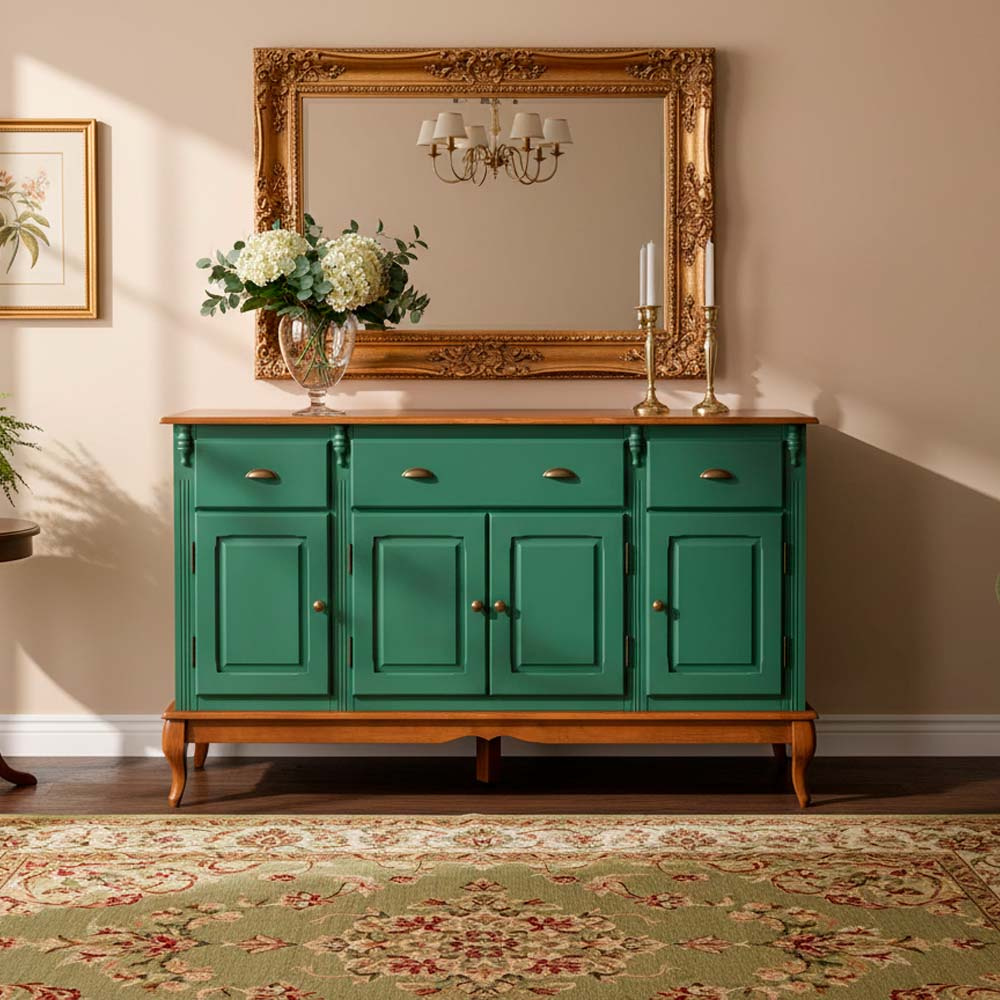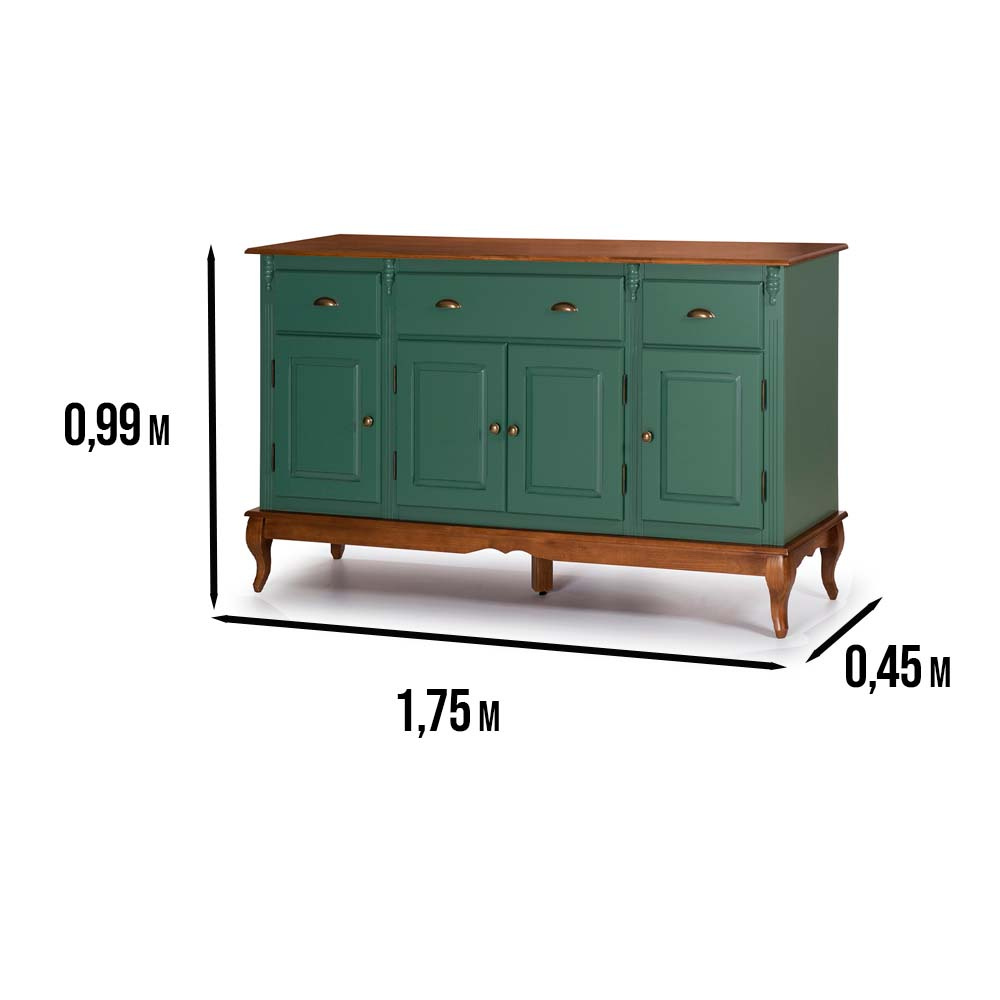 Balcão de madeira 4 portas Hanover pés Luis XV 99 x 175 x 45 cm (A x L x P). O balcão Hanover é a peça central perfeita para quem busca combinar a elegância clássica com a durabilidade da madeira maciça. Com um design atemporal, ele transforma qualquer sala de jantar, sala de estar ou hall de entrada em um ambiente sofisticado.Equipado com três gavetas e quatro portas inferiores, oferece espaço generoso para organizar louças, talheres, toalhas de mesa e outros itens essenciais. Puxadores em metal bronzeado e pés em estilo Luiz XV adicionam um charme antigo e refinado à peça. Possui 0,99 m de altura por 1,75 m de largura e 0,45 m de profundidade. O balcão de madeira é enviado montado.