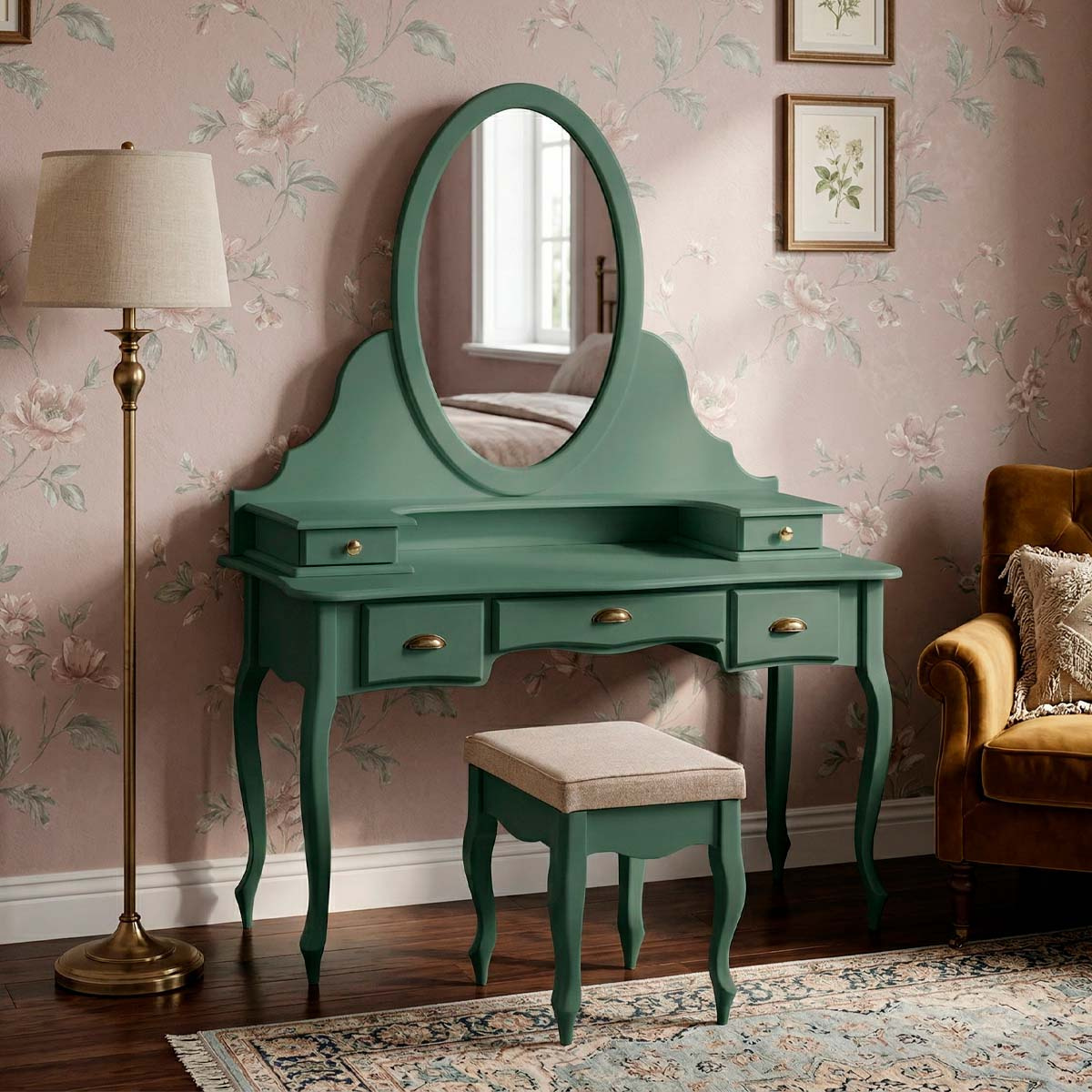 Penteadeira Louvre Com Banqueta Pés Luis XV 177 x 136 x 45 cm (A x L x P). Esta é uma peça que equilibra perfeitamente o charme clássico com a funcionalidade rústica. O grande destaque é o espelho central de formato oval, emoldurado por uma estrutura curva que remete ao estilo vintage. Possui um total de 5 gavetas — duas menores suspensas na bancada para itens de uso frequente e três gavetas maiores na base, ideais para organizar maquiagens, joias e acessórios. Acompanha uma banqueta exclusiva, estofada em tecido de tom neutro, projetada para encaixar-se perfeitamente sob a mesa quando não estiver em uso, otimizando o espaço do quarto ou closet.